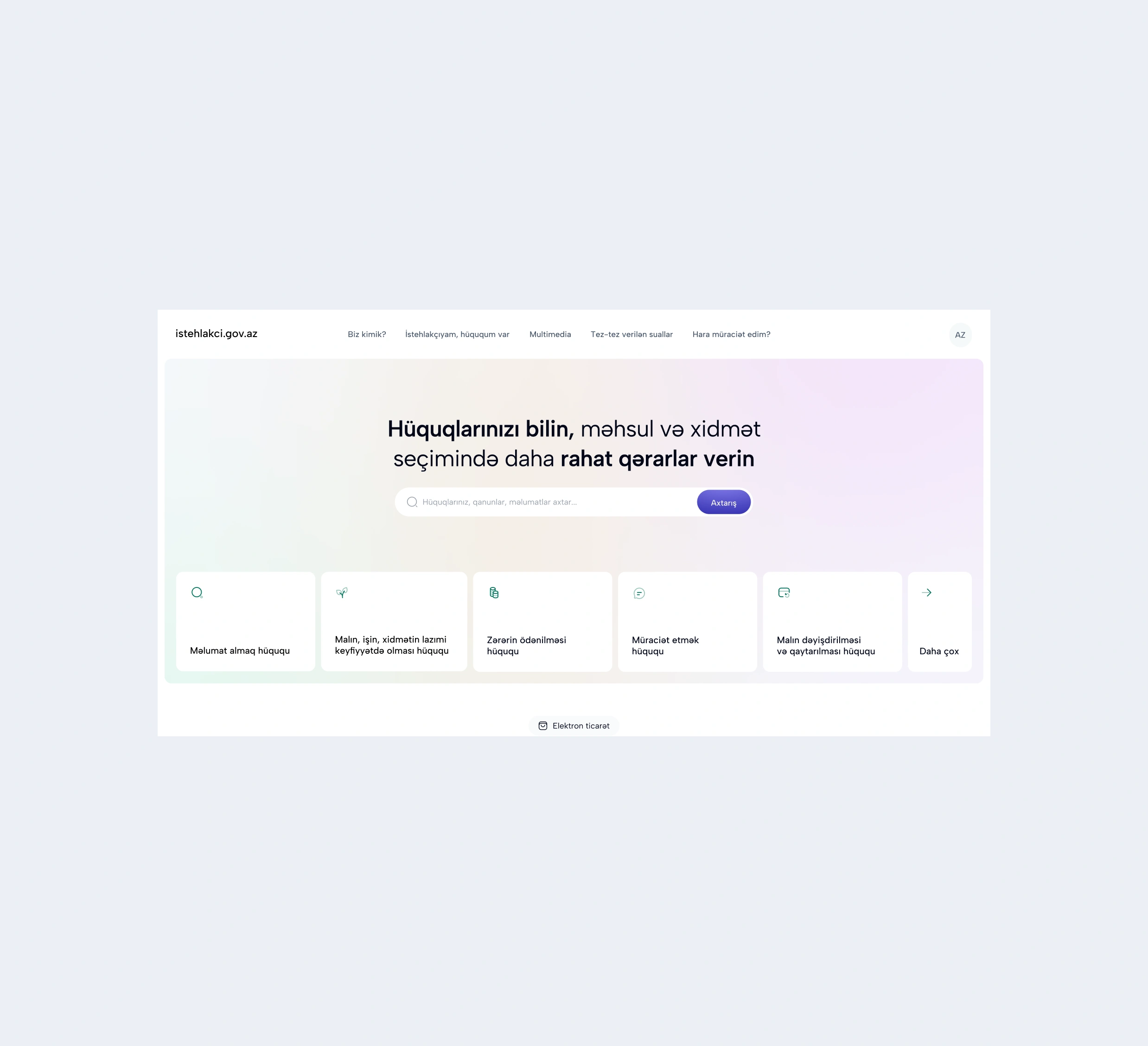 Ümumilikdə, sadə və aydın struktur, intuitiv naviqasiya və vizual elementlərin balanslı istifadəsi istifadəçi təcrübəsini yaxşılaşdırdı, platformada qalma müddətini artırdı və istehlakçı.az-ın etibarlı hüquqi məlumat mənbəyi kimi mövqeyini gücləndirdi.