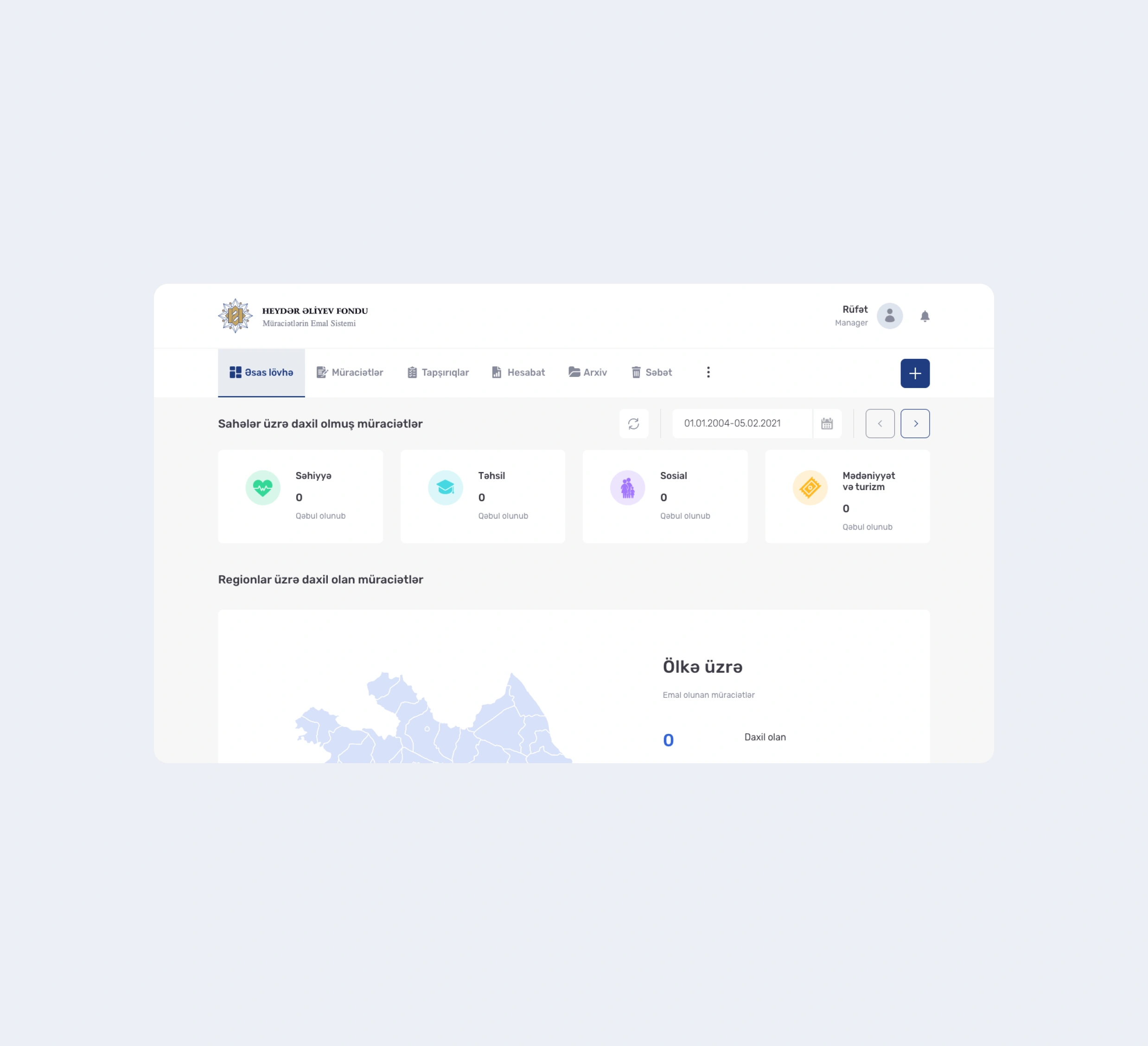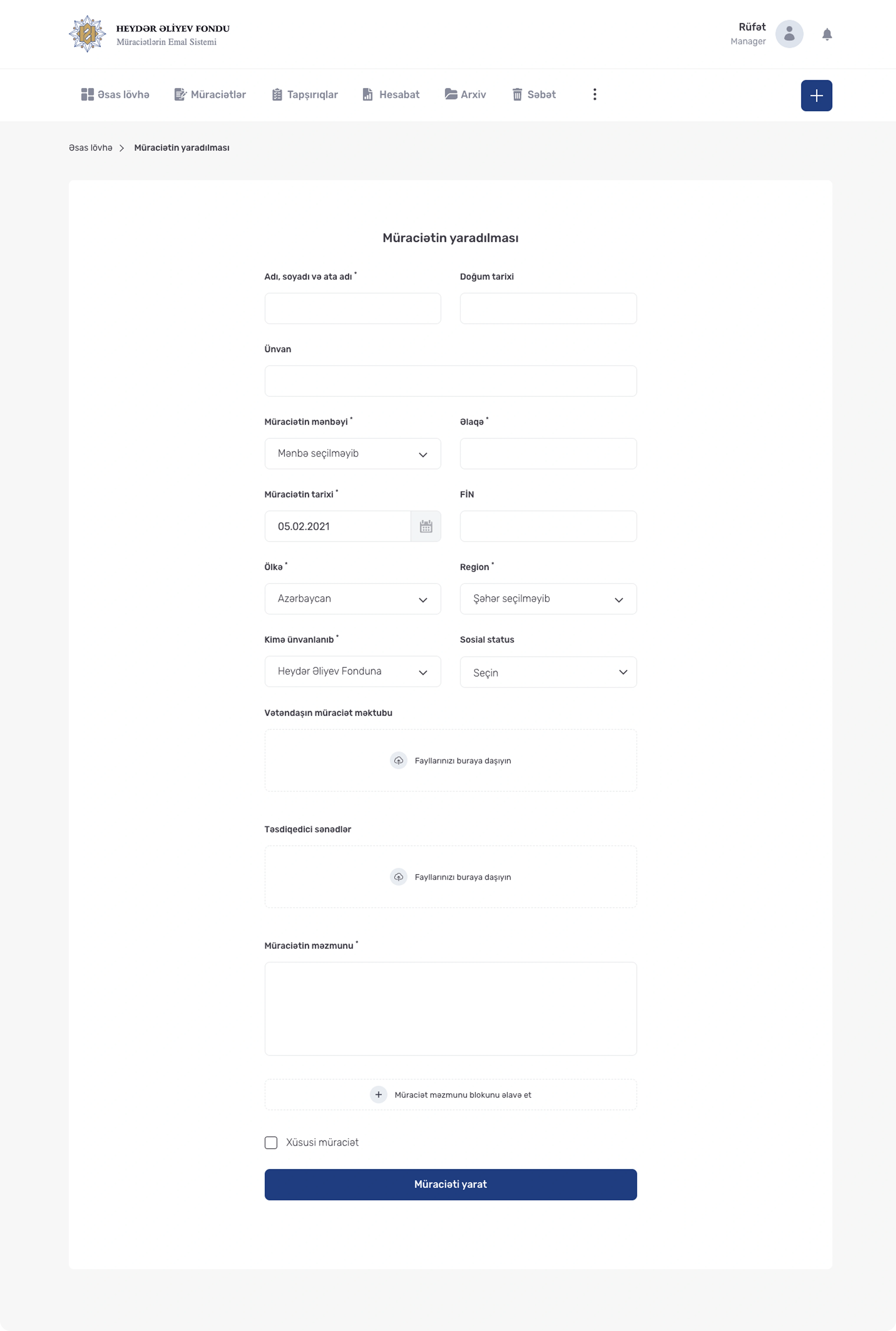 Heydər Əliyev Fondu üçün hazırlanmış “Müraciətlərin emal sistemi” vətəndaşlardan daxil olan müraciətlərin vahid rəqəmsal platforma üzərindən qəbulu, icrası və nəzarətini təmin edən daxili idarəetmə həllidir.
