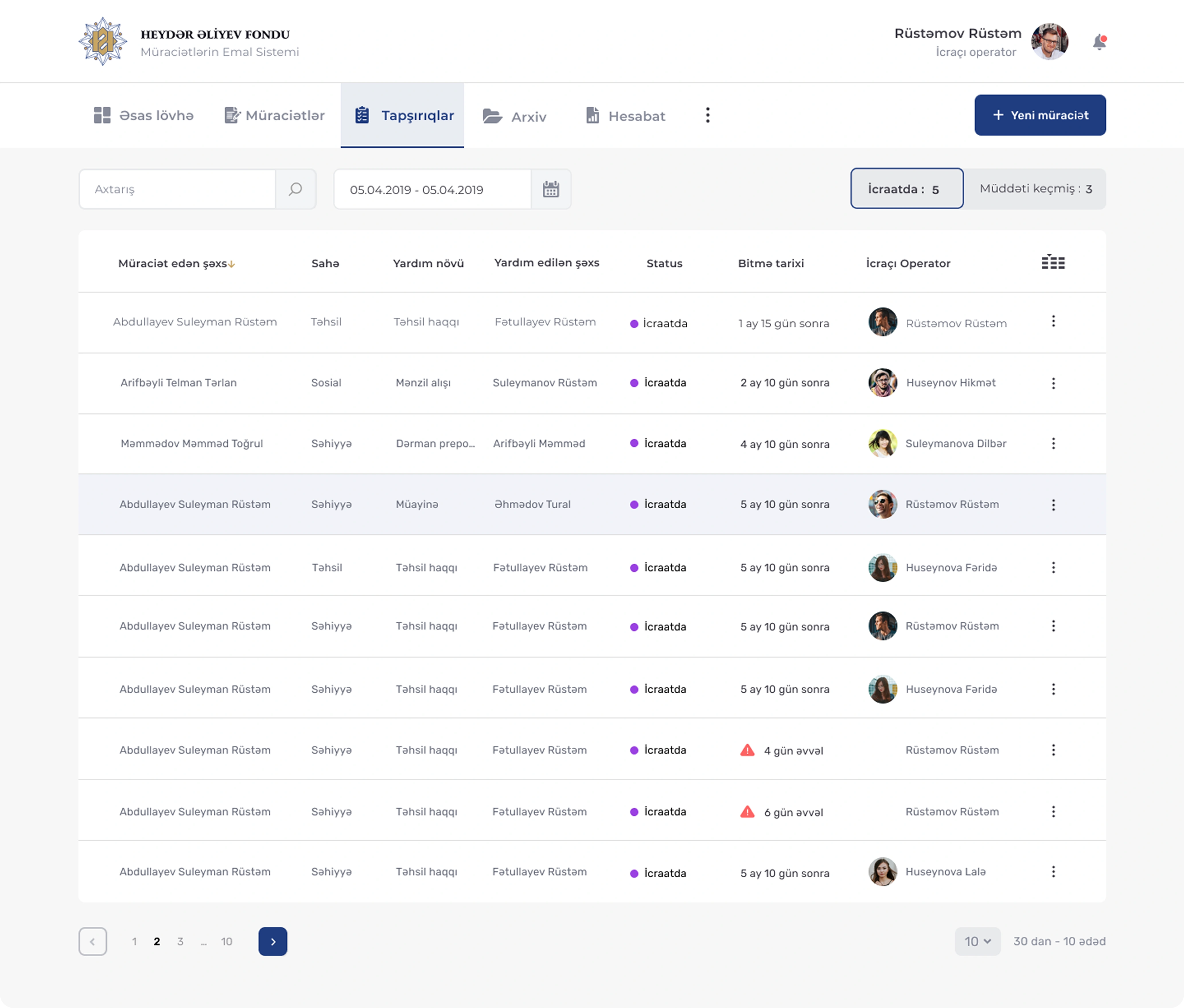 Biz müraciətlərin uçdan-uca istifadəçi axınlarını dizayn etdik, rol əsaslı girişlə səlahiyyətləri dəqiqləşdirdik. İcra və gecikmiş tapşırıqları vizual olaraq önə çıxardıq, qərarverməni dəstəkləyən analitik strukturlar və genişlənə bilən modul sistem qurduq.