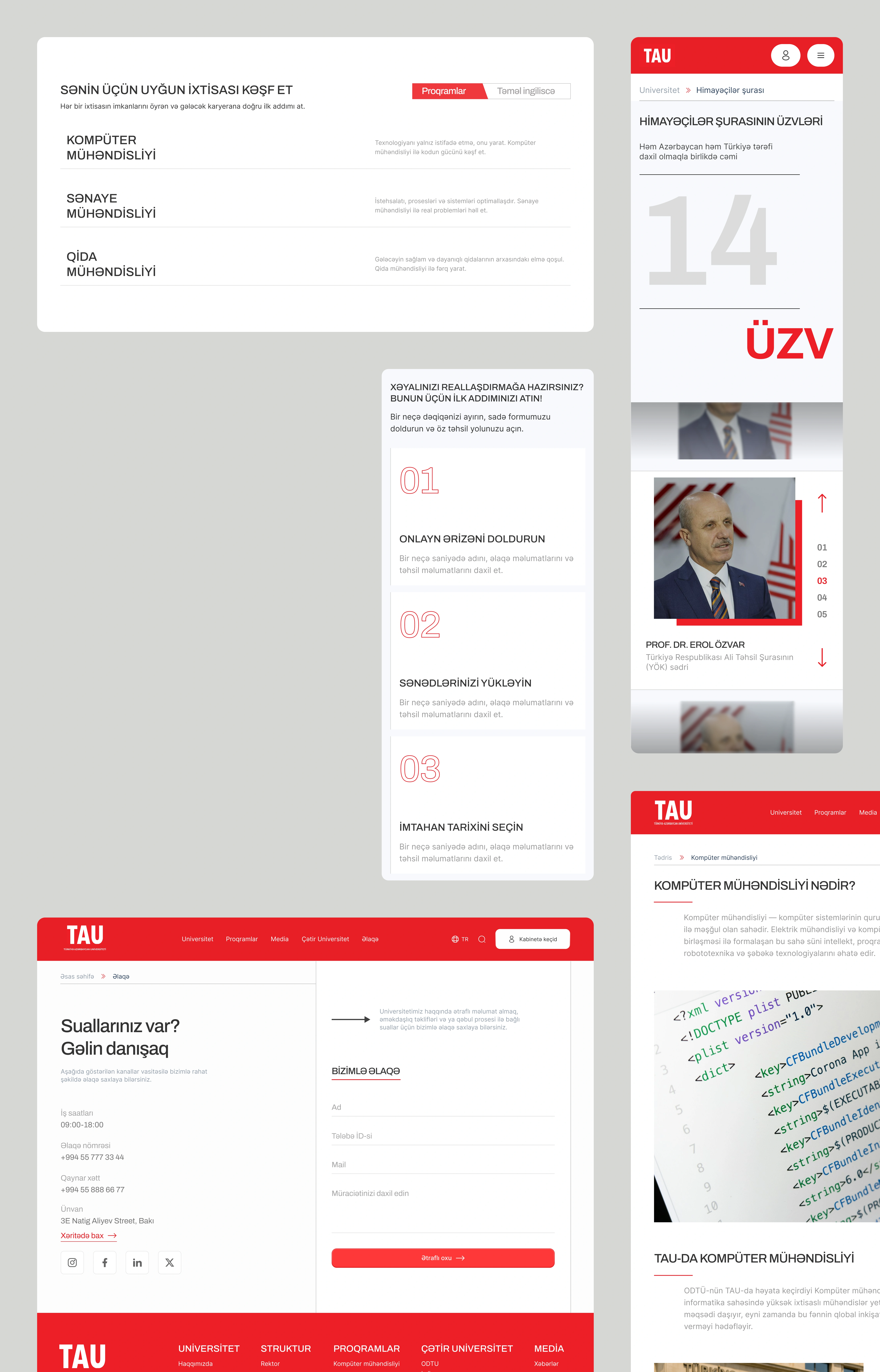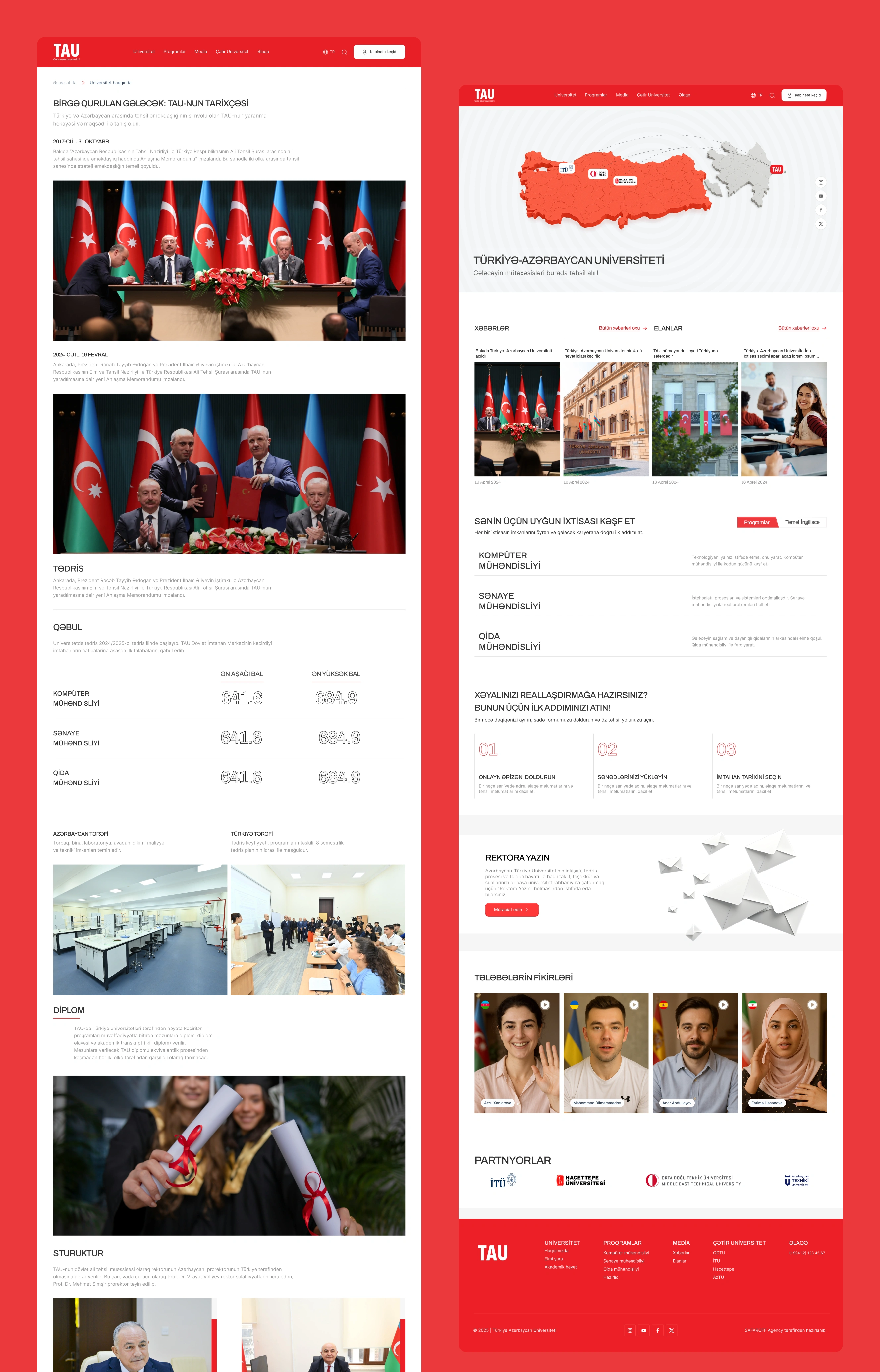 TAU-nun rəsmi veb saytı üçün dizayn prosesi istifadəçi ehtiyacları, akademik struktur və dövlət səviyyəli institusional imic balansı üzərində quruldu. Dizayn sistemi yaradılaraq rəng palitrası, tipoqrafiya, grid və komponentlər vahid standart altında birləşdirildi; bu yanaşma məzmunun oxunaqlığını artırdı və istifadəçilərin əsas məlumatlara daha sürətli çatmasını təmin etdi.