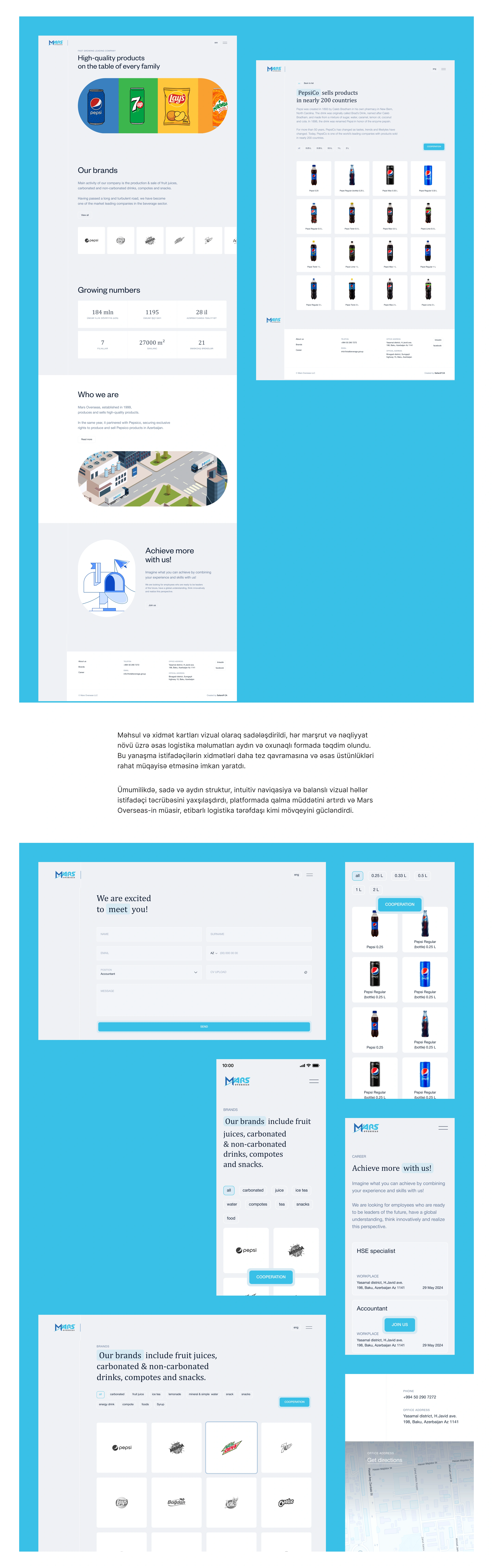 Mars Overseas beynəlxalq daşımalar və logistika sahəsində fəaliyyət göstərən şirkətin rəqəmsal platformasıdır. Layihənin əsas məqsədi müştərilərə şirkətin xidmətləri, marşrutları və logistika həlləri barədə aydın, aktual və etibarlı məlumat təqdim etməkdir. Məzmun rahat qavranılan strukturla hazırlanmışdır.